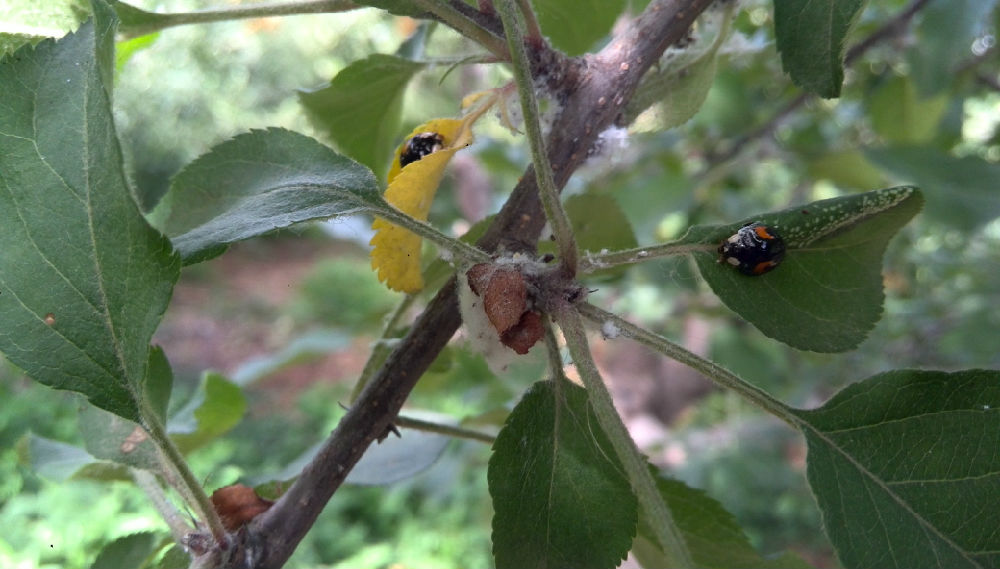 2、了解各病虫害的发生规律。说白了,每一种病害和虫害都应该落实到生物,生物的发展有规律、需条件,据此抓住时机,通常可以找到简单的防治措施。对于苹果来说,增强树体、通风透光、适时使用石硫合剂与波尔多液,好多病虫害就可以防住了。病菌通常需要在潮湿环境中滋生,所以解决果园郁闭问题,就不容易感病,多雨多湿的时期补充一下波尔多液或其他生物性杀菌剂也就可以防止病害蔓延。苹果棉蚜每年的繁殖都是从树干开始,前期发现只要树干和干周地面用一点喷点15波美度的石硫合剂,不需要额外的人工合成药物,就可以轻松防治棉蚜。简单来说就是制造不适合病虫害生长繁衍的条件,并做到“知其时,治其本”。
